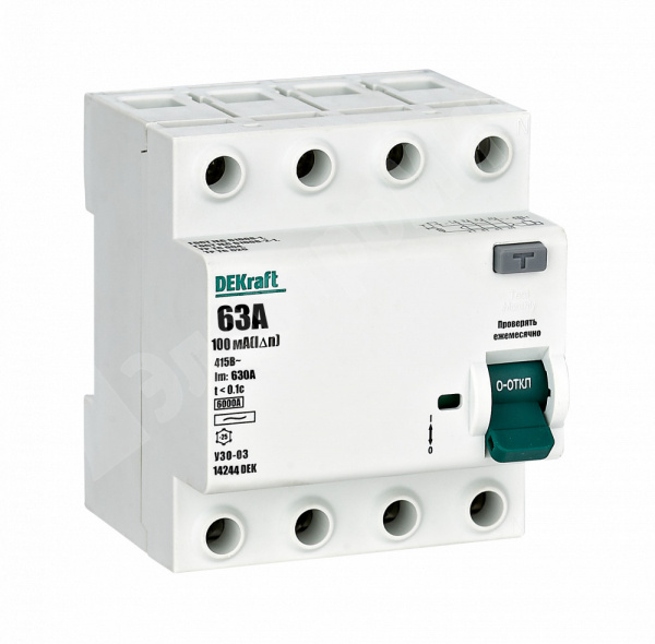 Выключатель дифференциального тока серии УЗО-03 Dekraft; 4P; номинальный ток 63 А; ном.дифф. ток 100 мА; электромеханический; тип дифференциального расцепителя - AC; на DIN-рейку. ВДТ устанавливаются в сетях напряжением до 400 В пер.тока. ВДТ применяются для защиты электроустановок от риска возникновения пожаров вследствие утечек тока. Конструкция устройств позволяет эксплуатировать их даже при низкой температуре.
