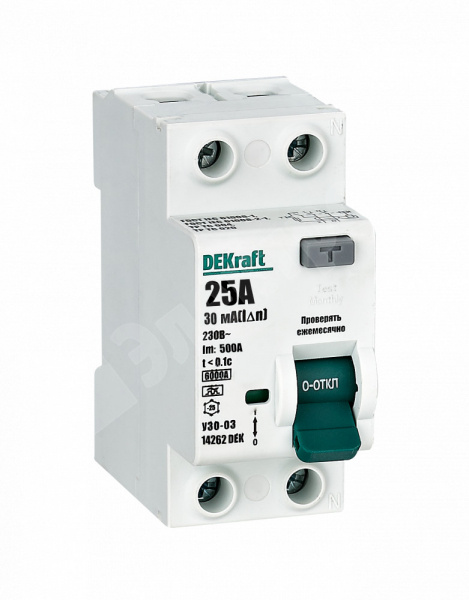 Выключатель дифференциального тока серии УЗО-03 Dekraft; 2P; номинальный ток 25 А; ном.дифф. ток 30 мА; электромеханический; тип дифференциального расцепителя - A; на DIN-рейку. ВДТ устанавливаются в сетях напряжением до 400 В пер.тока. ВДТ применяются для защиты электроустановок от риска возникновения пожаров вследствие утечек тока. Конструкция устройств позволяет эксплуатировать их даже при низкой температуре.